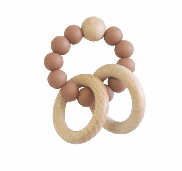 Smooth natural beechwood teether ring set in a beautiful warm cinnamon colour. Features easy to grab shape with soft silicone beads to massage sore gums. Modern and practical! Clean with damp cloth, warm soapy water, rinse clean and pat dry. Comes in a cotton gift bag.