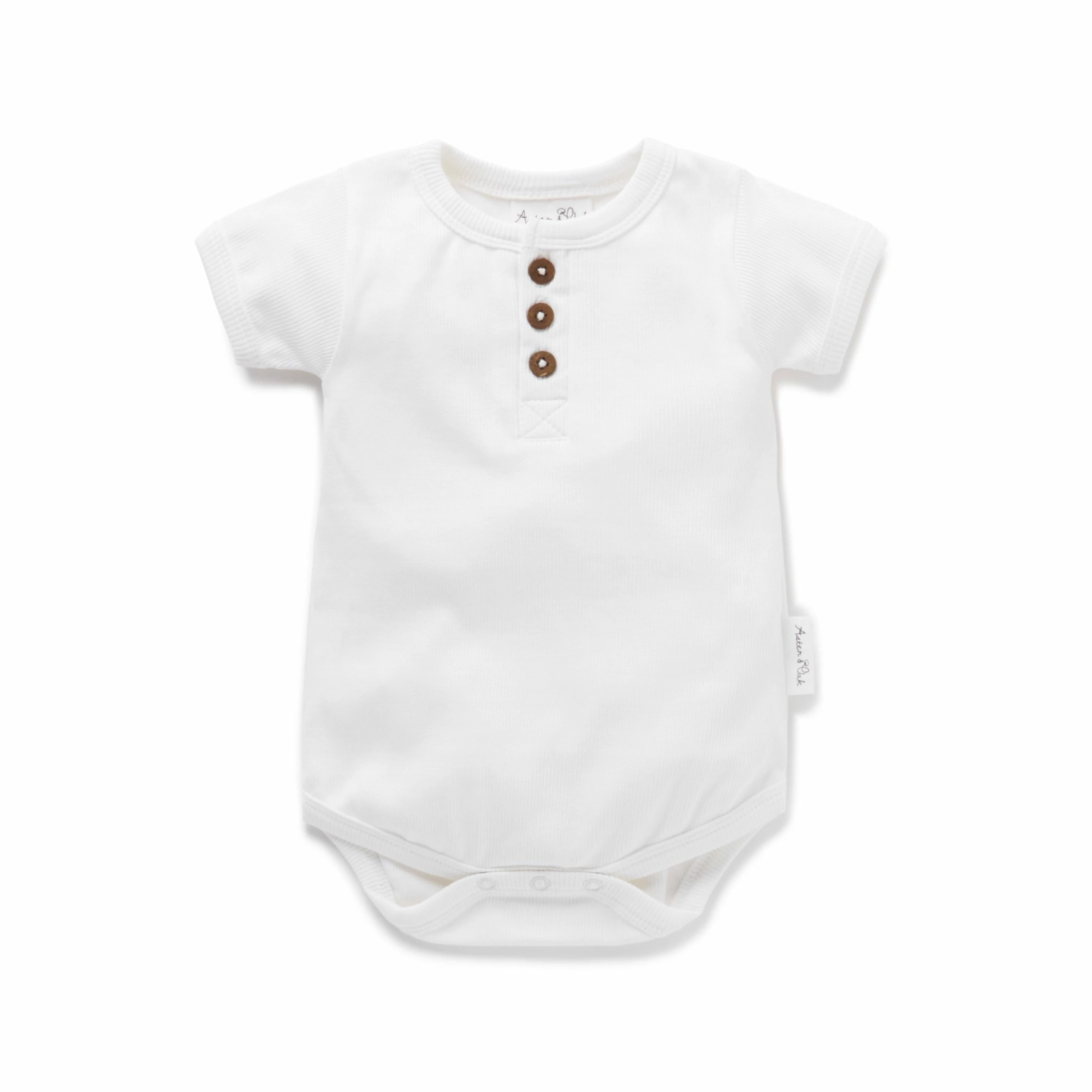 Made from GOTS certificated organic cotton. This cloud ribbed short sleeved bodysuit features custom buttons to the front and 3 snap buttons at the bottom. 97% Organic Cotton / 3% Elastane. Machine washable. Made in India.