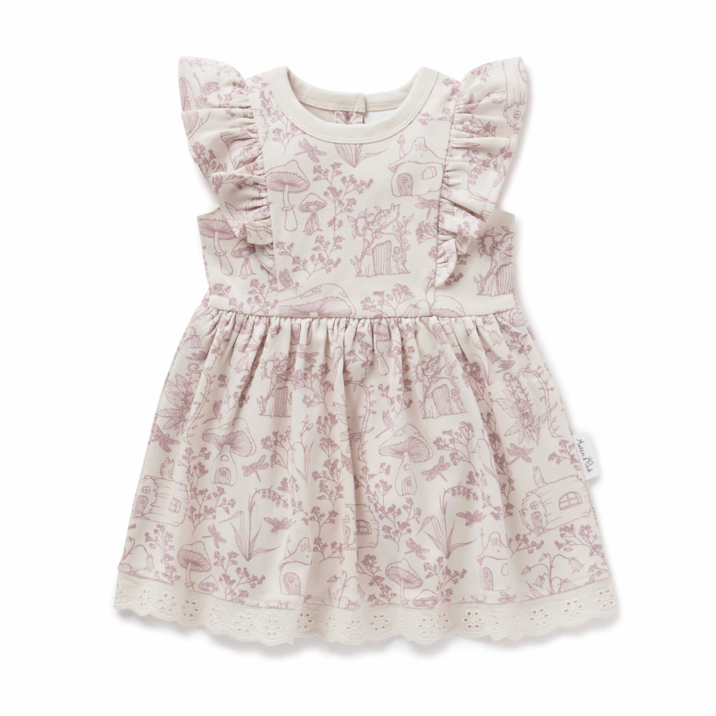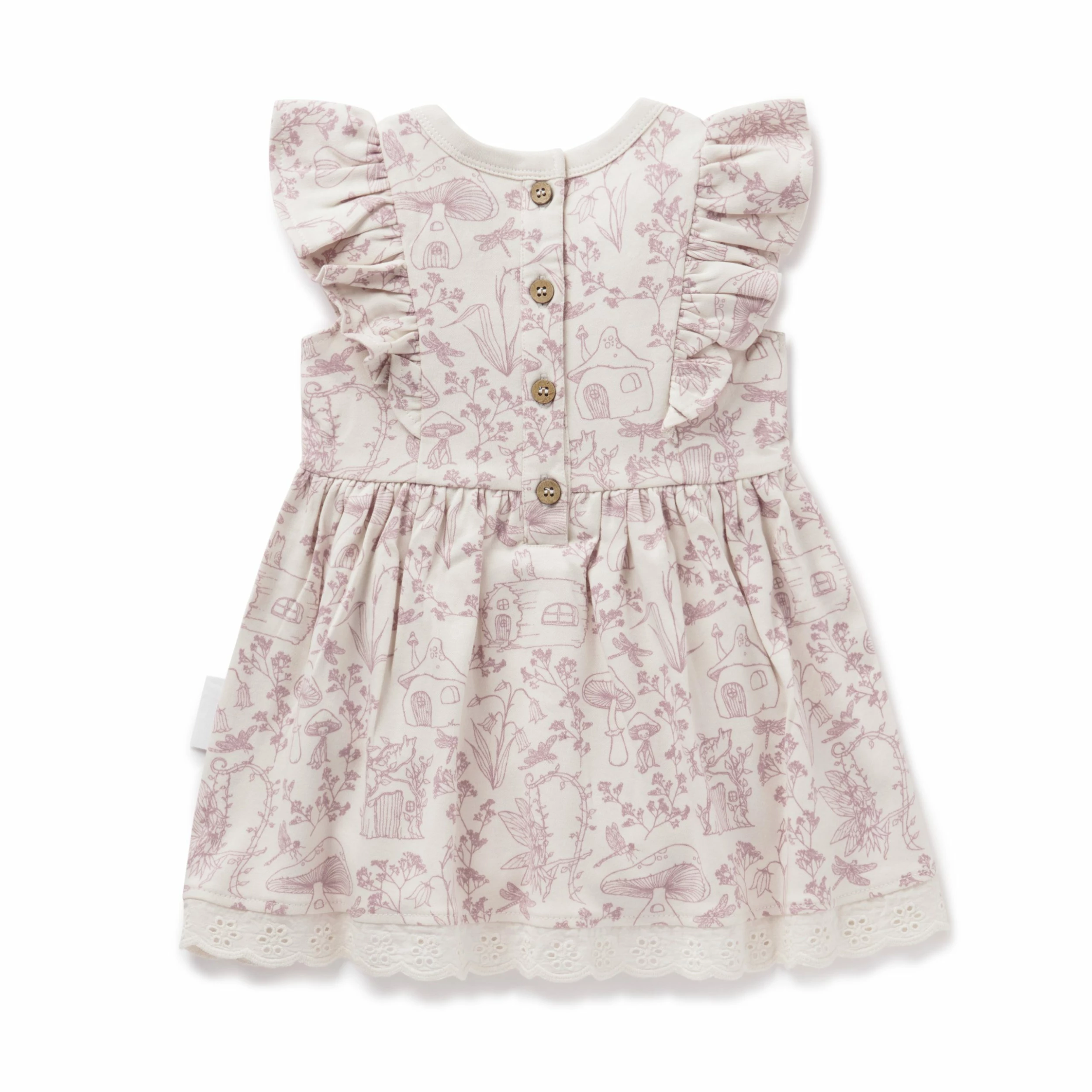 Made with GOTS certified organic cotton, this fairy garden ruffle dress features custom button detailing down the back, broderie anglaise lace trim around the bottom, flutter sleeves and a full flared skirt. 100% Organic Cotton. Made in India. Machine washable.