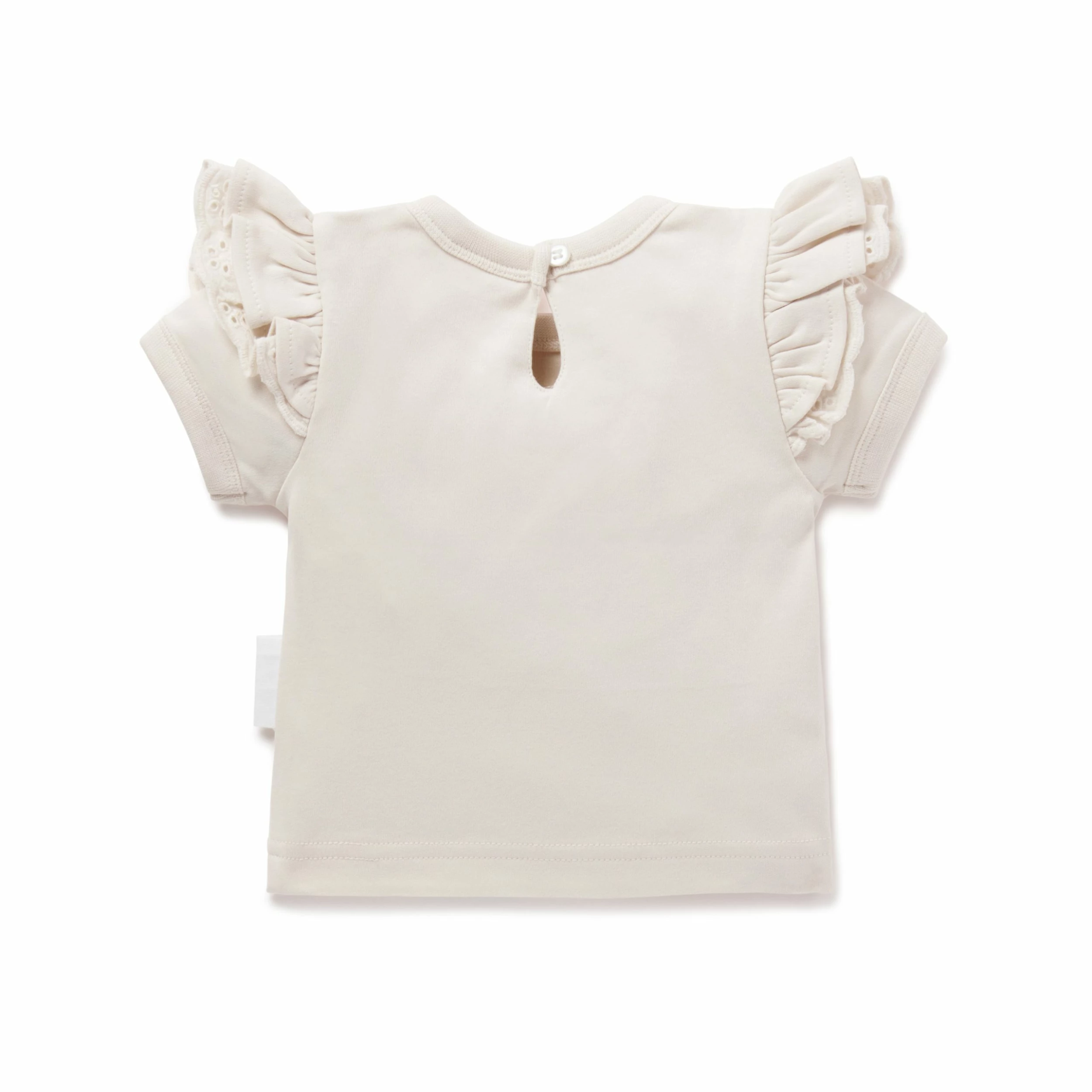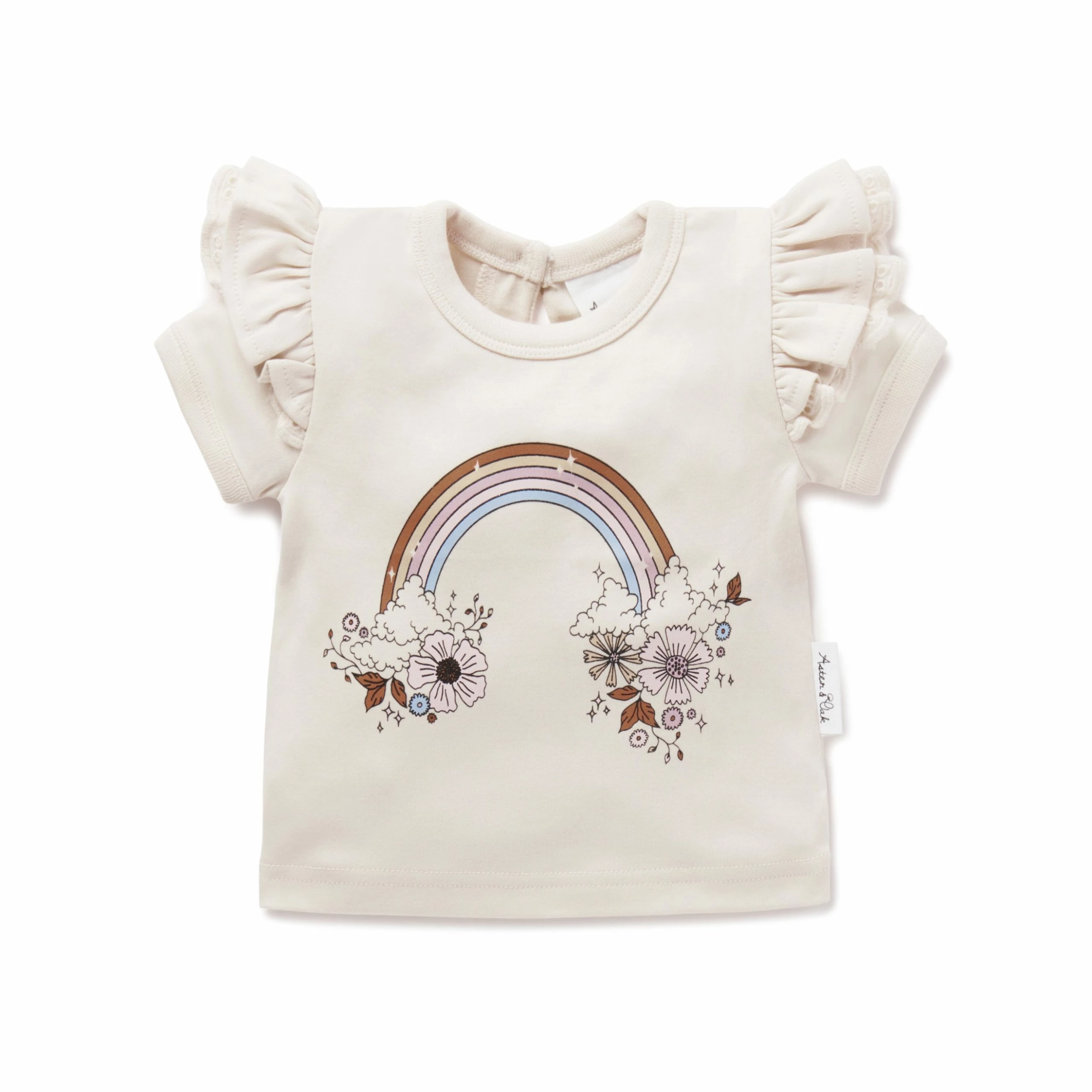 Made with GOTS certified organic cotton, this exclusive hand-illustrated rainbow print features a sweet ruffled short sleeve with broderie anglaise lace trim. 100% Organic Cotton. Made in India. GOTS certified. Machine washable.
