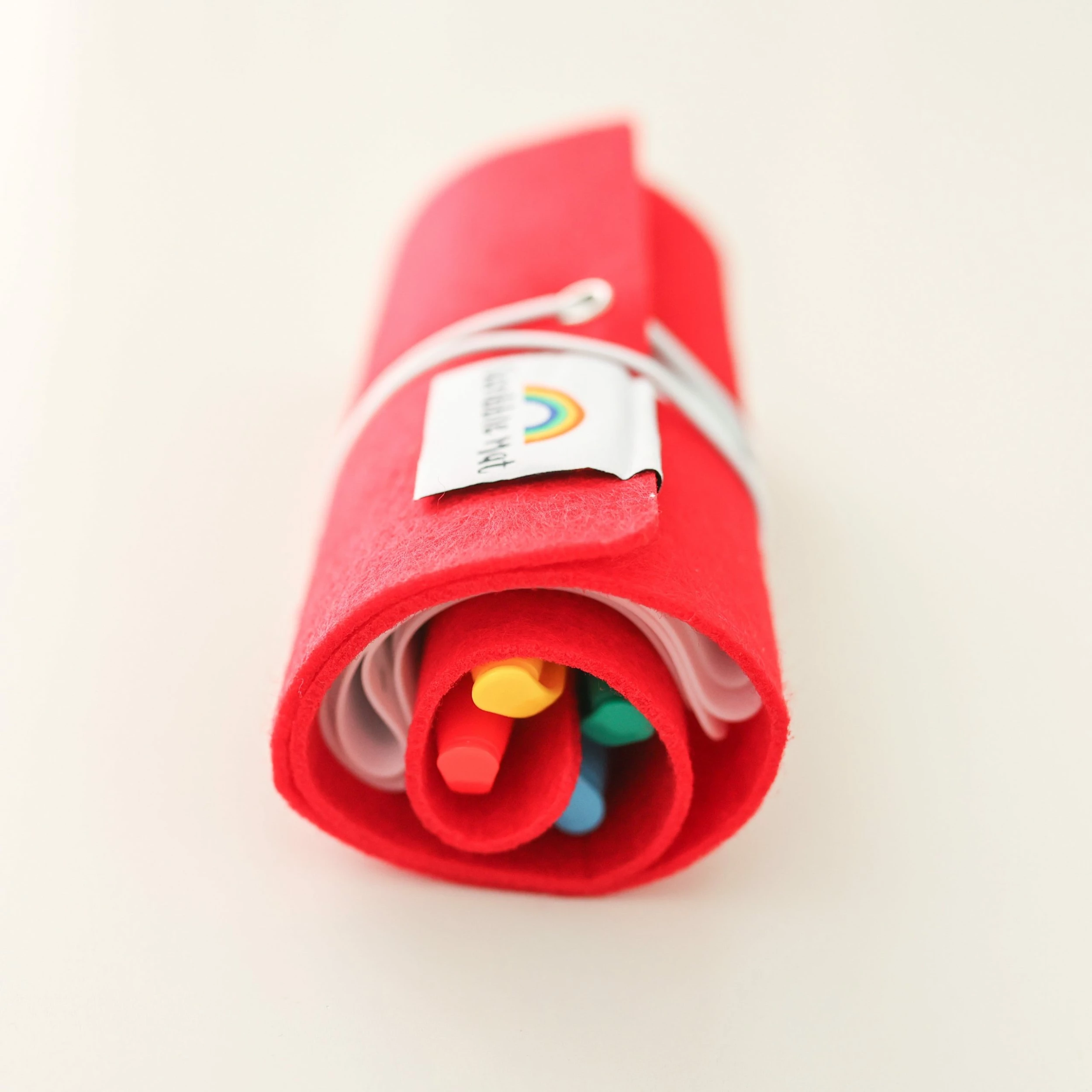 The perfect amount of pens for colouring on the go. Just enough for colourful designs, not too many to keep track of in a busy cafe or doctors waiting room. Each pen has its own slot in the durable felt roll-up case, helping little ones keep track when packing up.