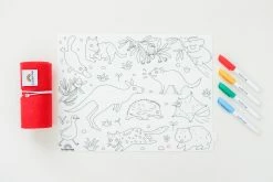 One reusable mat, four non toxic pens, red, yellow, dark green & light blue and a green felt pouch. Mats measure 40 x 30cm and wipe clean.
