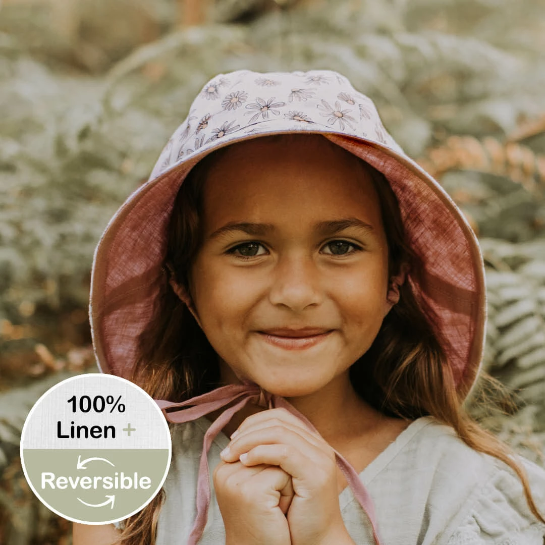 Shapely and stylish with a deep panelled crown, our girlâs bucket hats are light and cool on heads, making them hats kids donât even realise theyâre wearing! Made from 100% eco-friendly linen which can self-cool in summer and warm in winter, the Wanderer hat provides UPF50+ sun protection without overheating heads. The wide brims shield eyes and faces all year round, while the woven interfacing and thin cord edge in the brim gives a little more flexibility and shape without flopping in eyes.