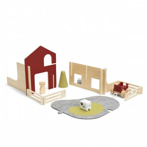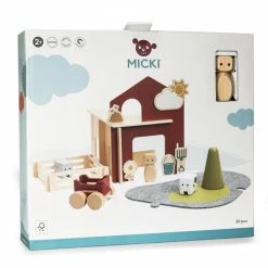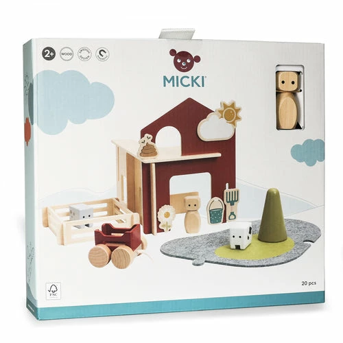 The Micki Play World Farm includes: 4 walls, 1 figurine, 2 animals, 4 fences, 1 tree, 1 trailer, 6 magnets (sun, flower, pitchfork, poo, bucket and watering can) and a 2-part felt play mat.