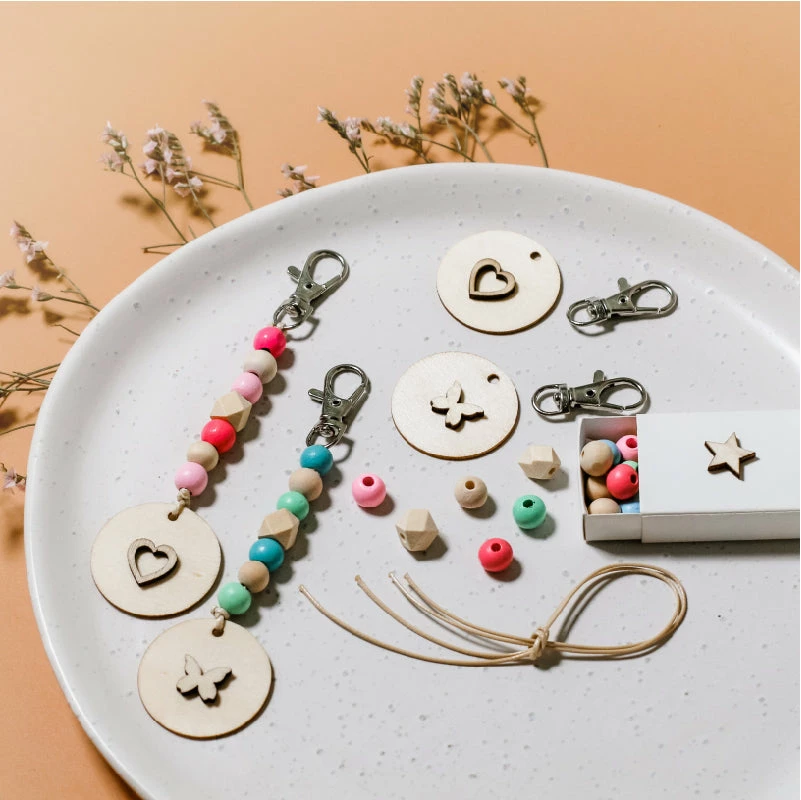 Children get the chance to make their own bag tag for school or daycare out of natural eco materials. We include enough wooden beads, metal clips and fun wooden decorations to make not one, but two bag tags.
