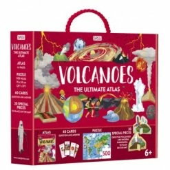 An atlas full of information and curiosities and a large box containing various fun and interactive activities dedicated to volcanoes to learn while having fun.