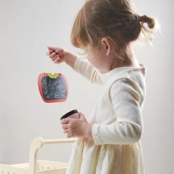 This shopping trolley features a fabric base that adds extra room for all those supermarket goodies and a sweet little apple-shaped chalkboard is perfect for writing a shopping list or drawing pictures.