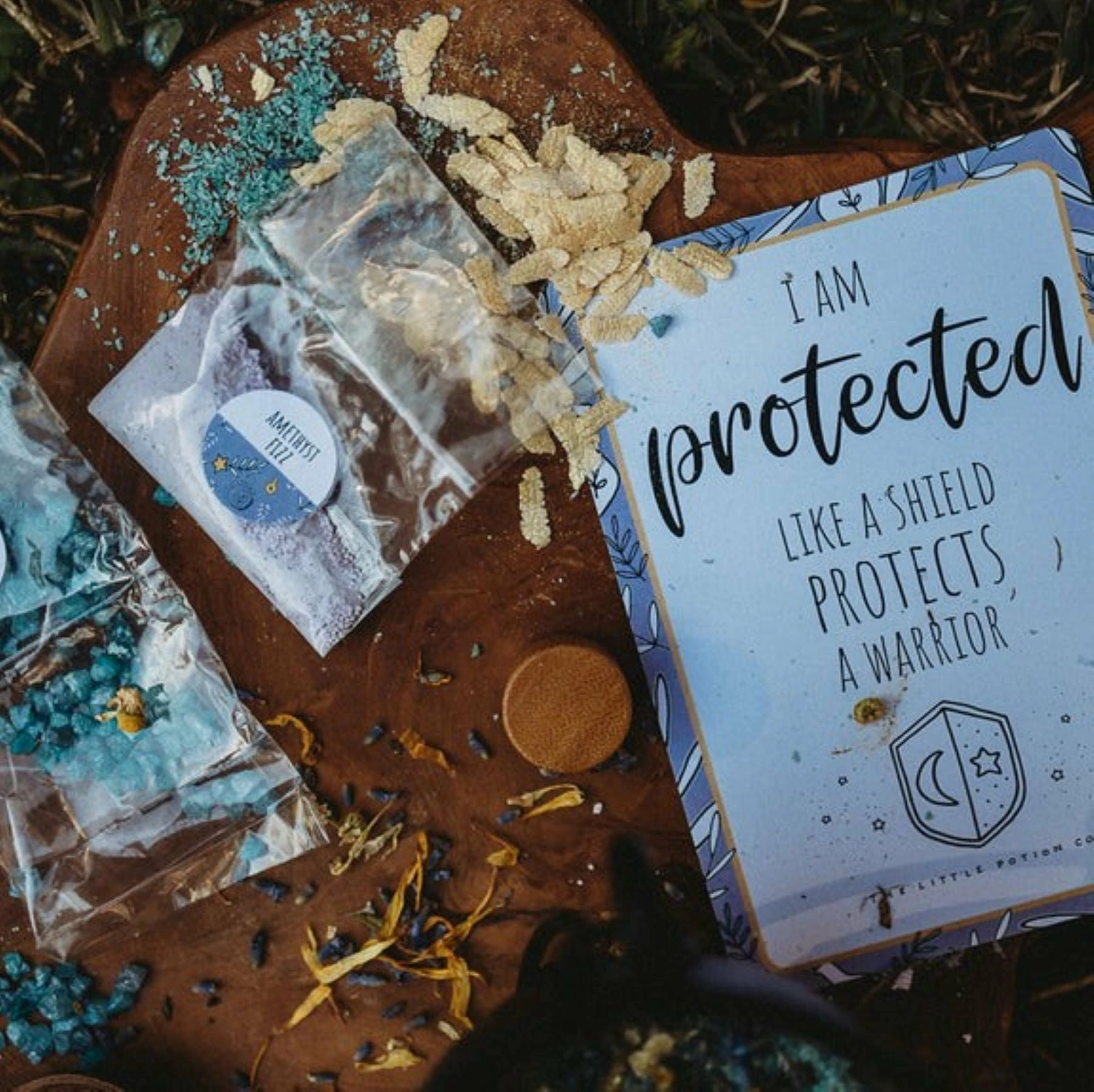 - 1 Potion Card – on one side is Shield Protect me spell. The other side is a I AM PROTECTED affirmation card to be recited as part of your child daily affirmation ritual.