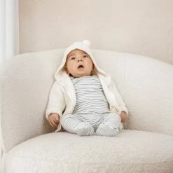 The rib bodysuit is made of organic cotton and offers all the comfort of a t-shirt with the ease of an all-in-one. It’s easy to put on, featuring an envelope neckline and a snap leg opening.